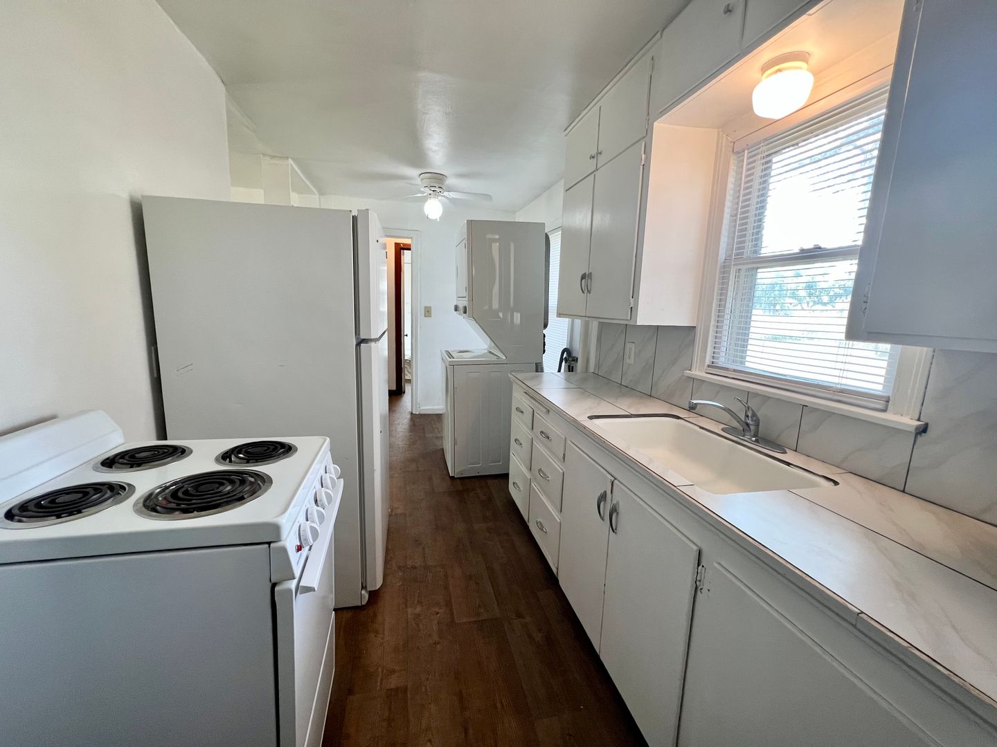 Adorable 1 bedroom house with stove, refrigerator and stackable washer and dryer unit