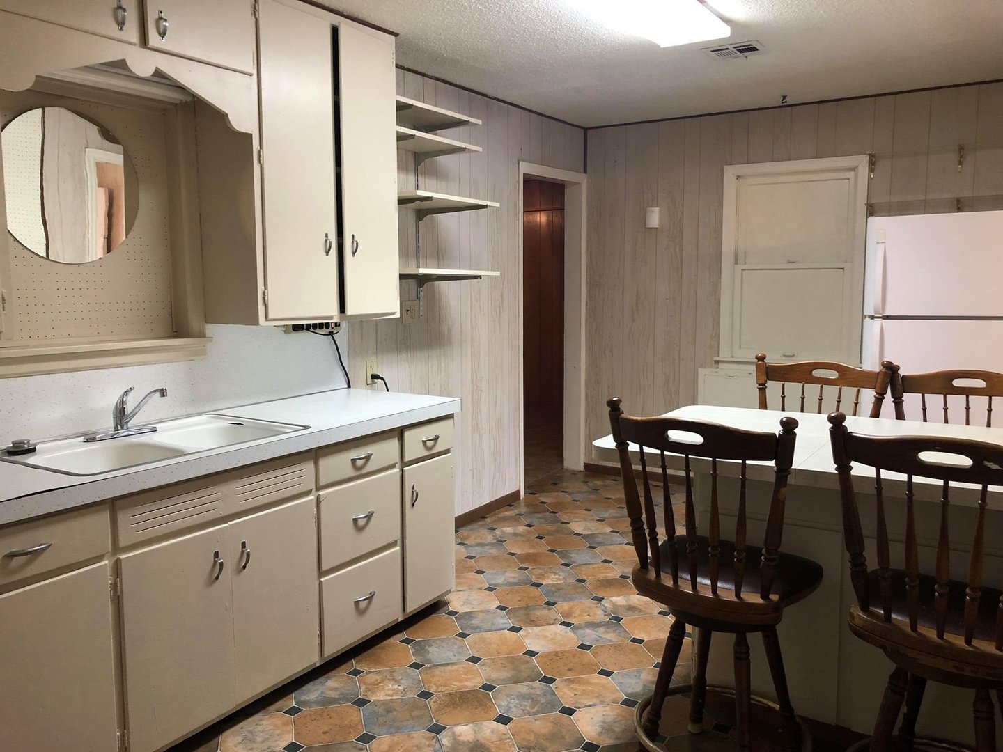 Kitchen is fitted perfectly with built in table(chairs included) and refrigerator.